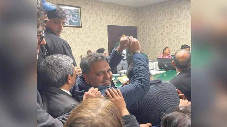At 10am, Fawad was brought to Lahore’s Cantt court by officials of the Punjab Counter Terrorism Department and police. Upon his entrance, PTI lawyers showered rose petals on Fawad.