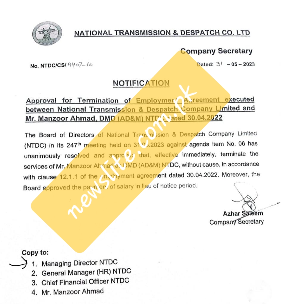 The BoD of NTDC in its 247th meeting held on 31-05-2023 against agenda item No. 06 has unanimously resolved and approved that, effective immediately, terminate the service of Manzoor Ahmad as DMD (AD&M) NTDC, without cause, in accordance with clause 12.1.1 of the employment agreement dated 30-04-2022. Moreover, the Board approved the payment of salary in lieu of notice period, said an official notification issued by the NTDC Company Secretary on May 31, 2023.