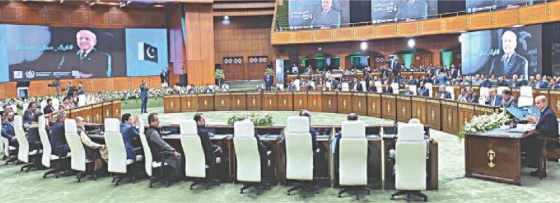 Finance Minister Muhammad Aurangzeb provided an economic overview, reporting a 71% return in the Pakistan Stock Exchange and the highest current account surplus in 20 years. He detailed initiatives such as rightsizing 43 ministries, pension reforms, agriculture taxation, and a faceless tax assessment system that boosted revenue by 60%.