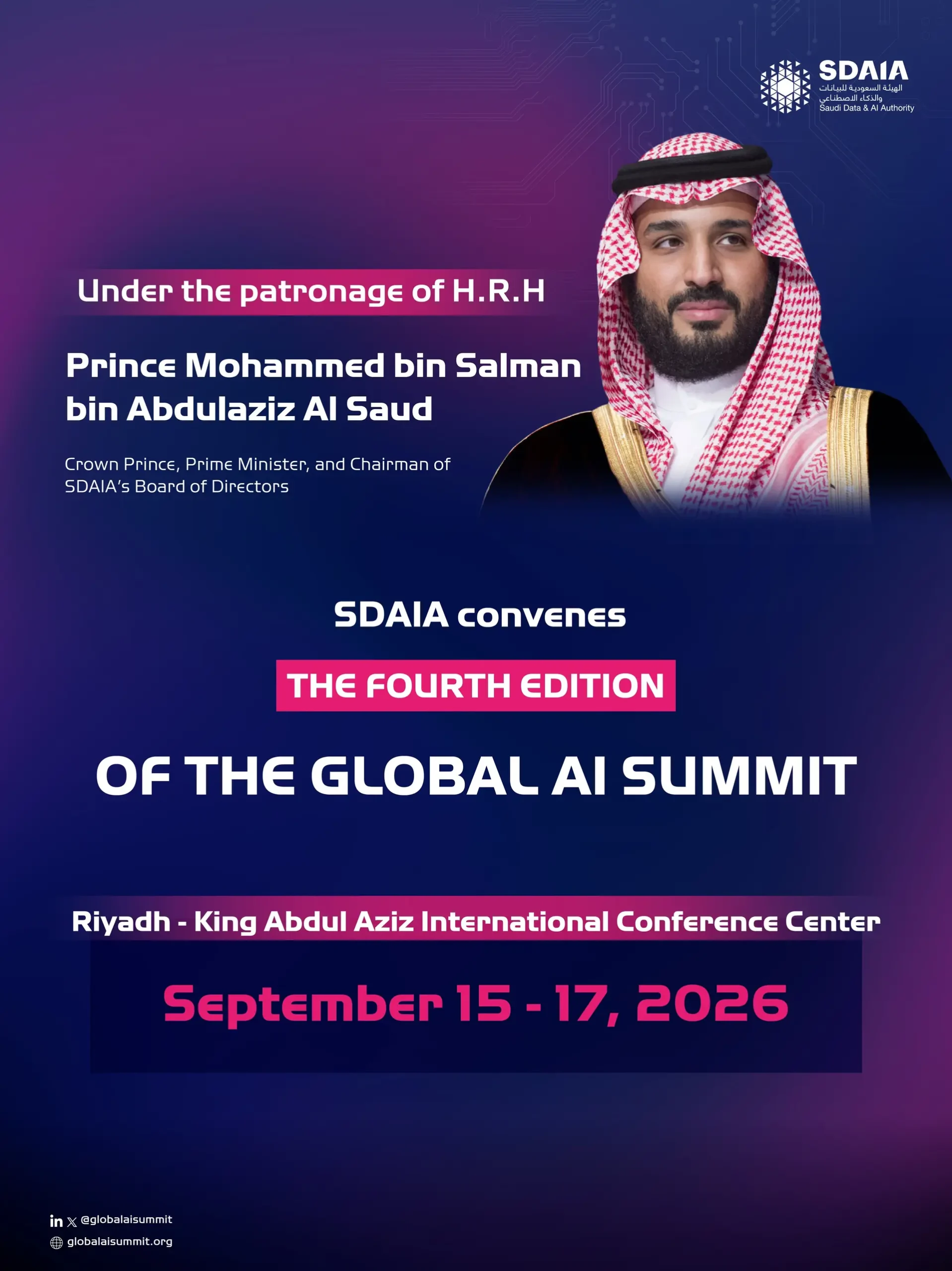 The Saudi Data and AI Authority (SDAIA) will host the fourth edition of the Global AI Summit in Riyadh from September 15 to 17, 2026, under the patronage of His Royal Highness Prince Mohammed bin Salman bin Abdulaziz Al Saud, Crown Prince, Prime Minister, and Chairman of SDAIA’s Board of Directors.